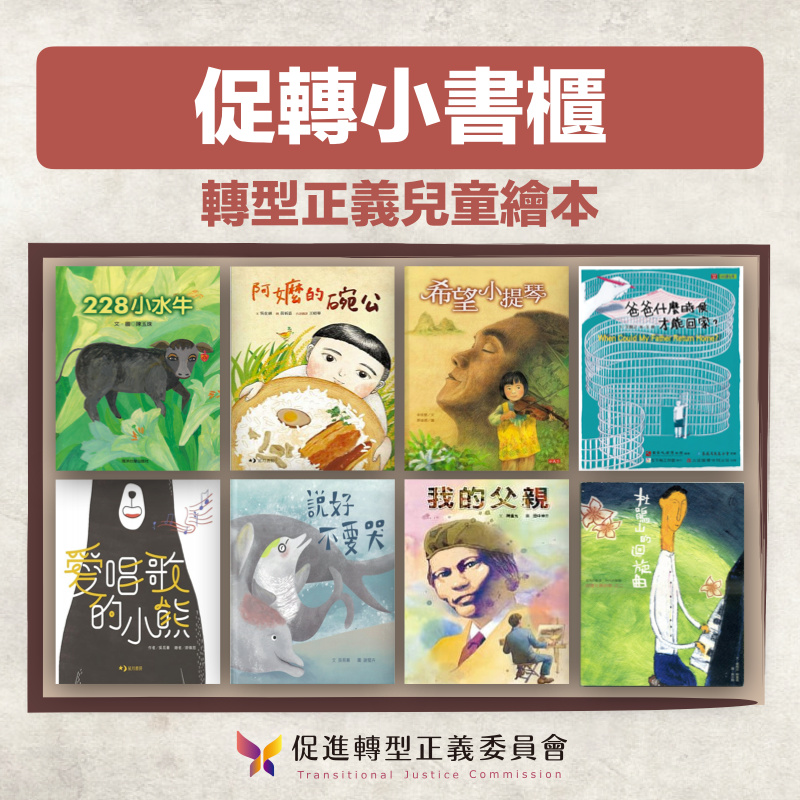促轉會推薦的兒童繪本包括了,《杜鵑山的迴旋曲》、《二二八小水牛》、《我的父親》、《希望小提琴》、《阿嬤的碗公》、《愛唱歌的小熊》、《說好不要哭》、《爸爸什麼時候才能回家?》,這些繪本改編自過去轉型正義過程中,前輩們在二二八事件與白色恐怖時期,曾經經歷過的故事。促轉會表示,透過這些台灣本土出版社的繪本,希望能讓大家對於二二八事件與白色恐怖的歷史有更多認識。