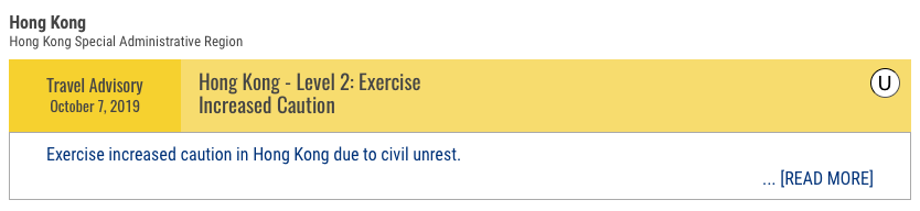 根據國務院最新旅遊警示內容,香港多個區域自 6 月以來,發生大大小小規模的政治示威抗爭,地點包含在地鐵站、購物中心及香港國際機場。旅遊警示也表示,雖然抗爭大致和平,但有時會變暴力並打亂香港交通。