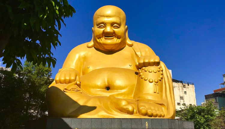 一九七五年,我在臺中讀高中時,假日閒盪,偶然見到一尊佛像高高聳立前方,走近觀看,始知是寶覺寺彌勒大佛,寺廟庭外也有一尊約莫人身大小的斜坐彌勒佛,佛旁豎立石碣,上書:「大肚包容了卻人間多少事,滿腔歡喜笑開天下古今愁。」