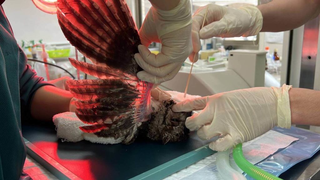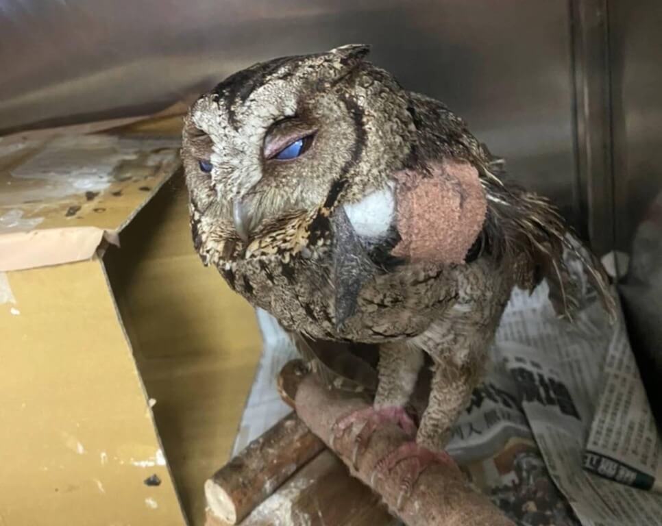 園方說明,這隻領角鴞被救傷人員發現無法飛行,在 3 月 19 日送來給獸醫檢查治療。獸醫師先用藥物及氧氣輔助減少緊迫,進行麻醉、抽血並拍攝 X 光,發現牠的左翅橈尺骨骨折,而且附近皮膚因骨折造成破裂,周邊沾上血液的羽毛已乾凅。