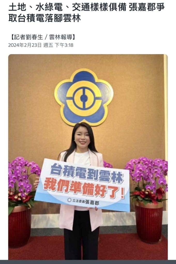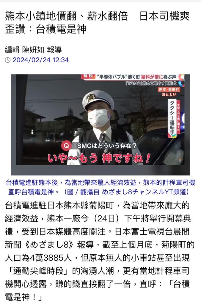 分享 台積電在熊本,連當地司機都大讚經濟效應驚人。 桃園市政府觀旅局局長的立委太太張嘉郡表示:「台積電希望你來雲林,雲林準備好了」 桃園人表示⋯⋯ 桃園市張市府市長真的有認真爭取台積電回來嗎? 圖片來源:截自 魏筠 臉書 圖片來源:截自 魏筠 臉書 原文出自魏筠臉書,芋傳媒經授權轉載。 台積電桃園 分享 FacebookGoogle+電子信箱LINELinkedinTelegram