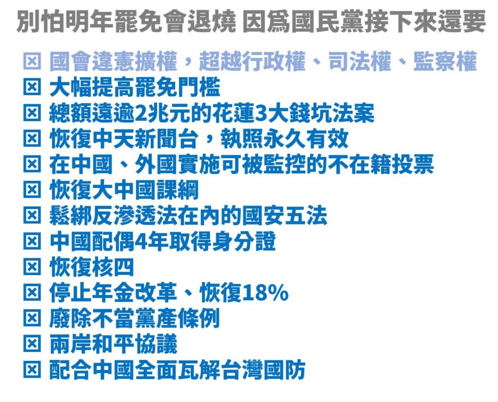 分享 國民黨不只要國會擴權。 他們接下來要大幅提高罷免門檻、總額遠逾 2 兆元的花蓮 3 大錢坑法案、恢復中天新聞台且執照永久有效、實施國外不在籍投票、恢復大中國課綱、鬆綁反滲透法在內的國安五法、中配 4 年取得身分證、恢復核四、停止年金改革、廢除不當黨產條例、兩岸和平協議、配合中國全面瓦解台灣國防。 圖片來源:取自 曾韋禎 臉書 原文出自曾韋禎臉書,芋傳媒經授權轉載。 不當黨產年金改革提高罷免門檻 分享 FacebookGoogle+電子信箱LINELinkedinTelegram