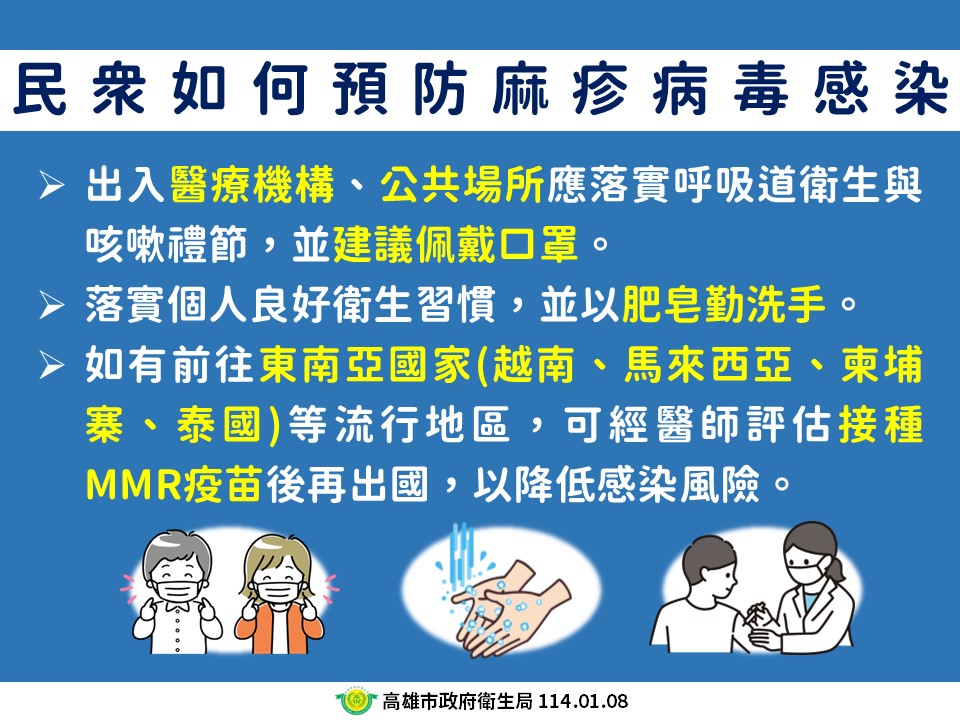 - 如有前往東南亞國家(越南、馬來西亞、柬埔寨、泰國)等流行地區,可經醫師評估接種 MMR 疫苗後再出國,以降低感染風險。