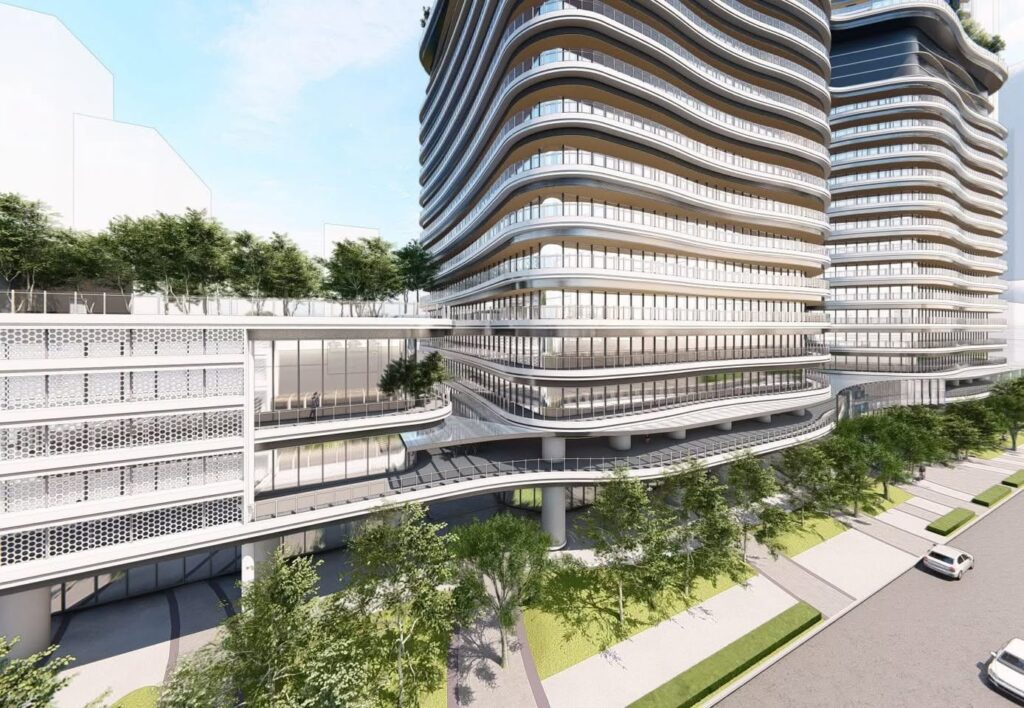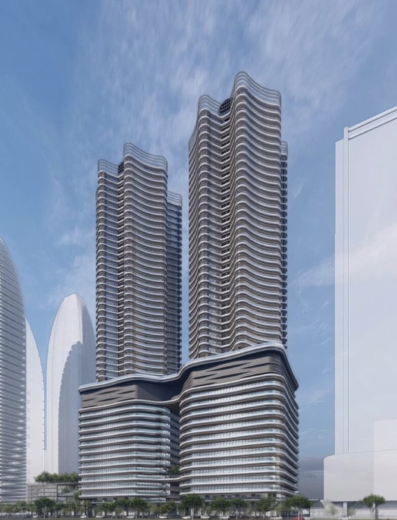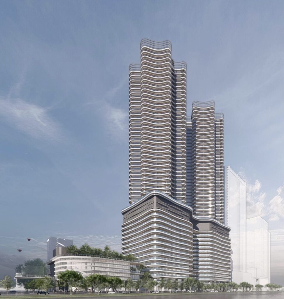 南之北基地由國揚與台灣人壽組成的星紀元團隊投資 234.6 億,興建兩棟 48 層雙塔住商大樓,以及一棟 3 層樓商場,規劃會比北基地有意思,總高含樓頂機房剛好到 200m 左右,也會是特貿三最高的建築。