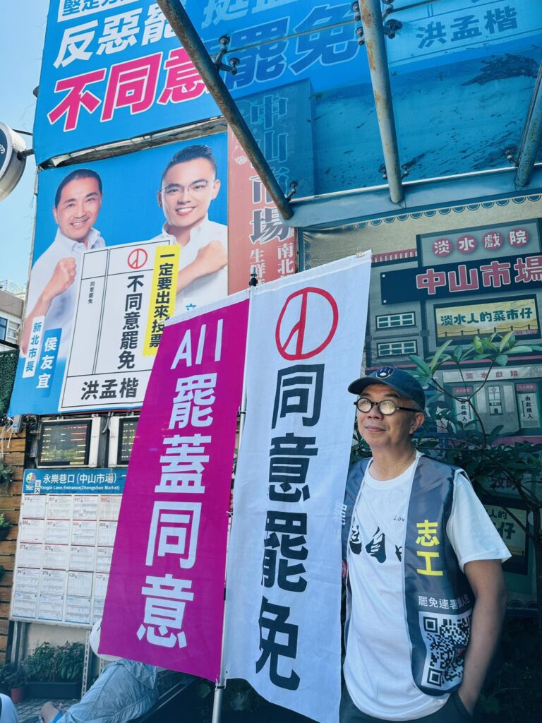 分享 整個淡水滿山滿谷都是洪的反罷免的廣告,但卻沒有商家願意給我們罷團空間上廣告。沒關係,我們有像Hiro這樣行動自由的「同意罷免」的活廣告。 #我們不是惡罷。憑什麼?我們不犯法,這是公民正正當當的權利。洪大立委也有權利反對我們的罷免行動,但你憑什麼稱我們是惡罷?才剛當選就要提高人民可以制衡惡民代的罷免權利的困難度。你才是惡僕! #全國民黨上上下下非法抄名冊違法使用他人個資的罷免才是惡罷! #大罷免大成功 #大罷免救台灣 #罷洪刻不容楷 圖片來源:取自 Li-Lin Cheng 原文出自 Li-Lin Cheng臉書,芋傳媒經授權轉載。 大罷免大成功大罷免救台灣淡水罷洪刻不容楷 分享 FacebookGoogle+電子信箱LINELinkedinTelegram