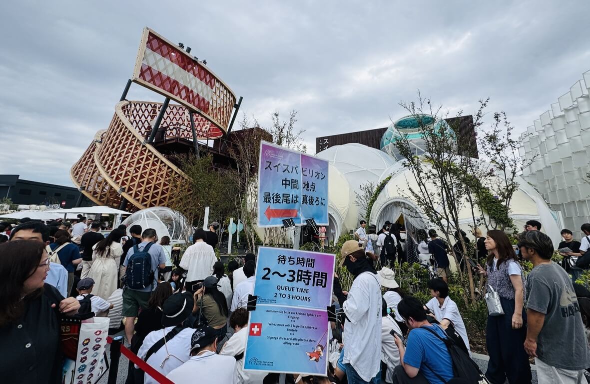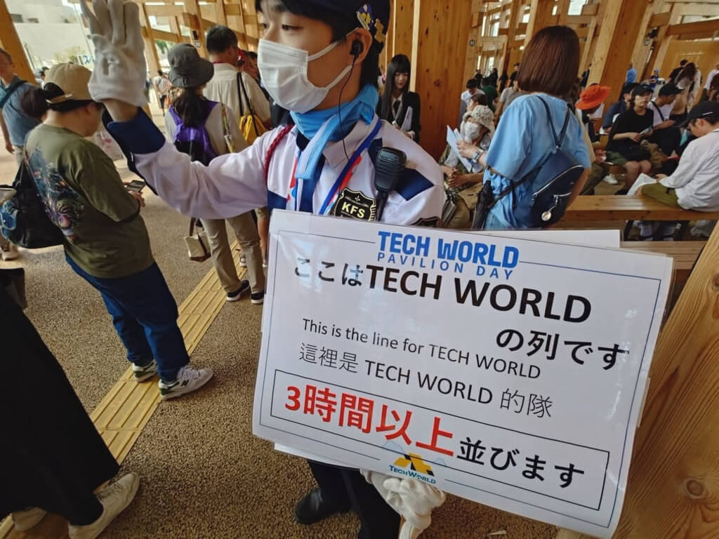記者實際走訪週日的世博,會場內如同「排隊地獄」。進入展館要排隊、餐廳吃飯要排隊,就連上廁所也要排隊。部分高人氣展館只接受事先預約,不開放現場排隊,原本人氣不高的展館,現在也要動輒排上數小時。