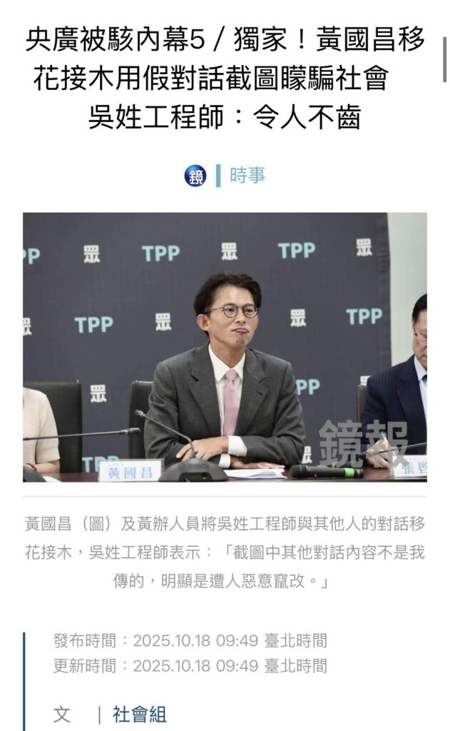 若《鏡週刊》報導屬實,黃國昌及其辦公室涉嫌「捏造對話截圖」、「移花接木」、「誤導媒體」,這不只是政治爭議,而是誠信崩壞、人格破產的行為。身為公職人員,他的任何謊言,都是對全民的背叛。