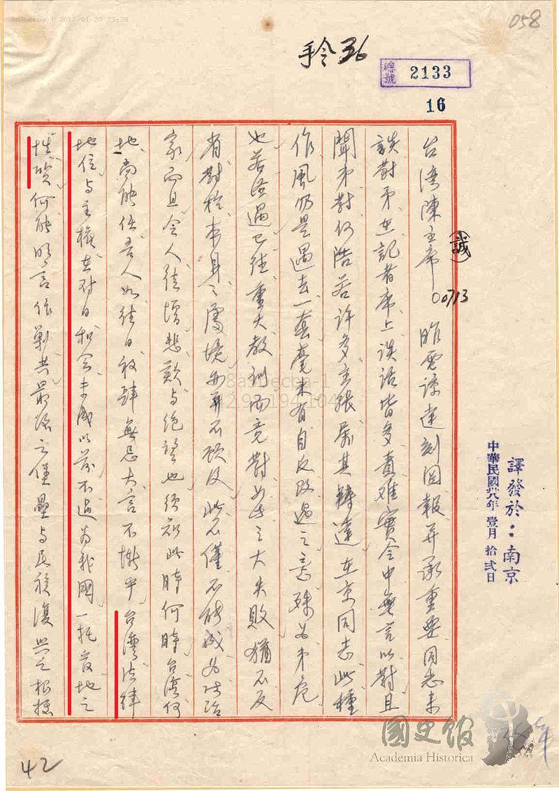 明白指出「同盟國將福爾摩莎的治理及託管工作交給中國,一如日本被交給我們,而且現在仍處於那樣的狀態下。」