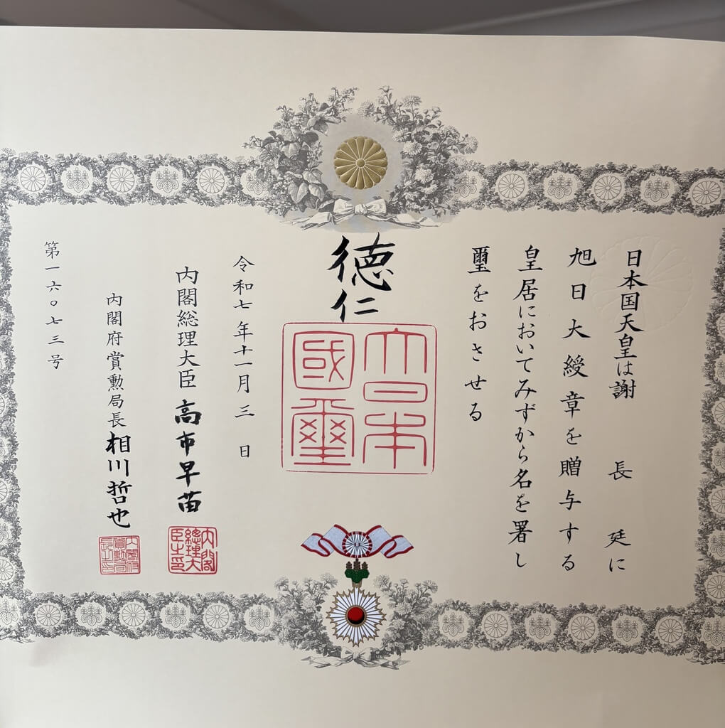 日本秋季授勳的大綬章親授式今天舉行,日皇德仁在皇居「松之間」親自授勳,日本首相高市早苗遞交勳記(授予勳章的證明文件)。總統府資政、前駐日代表謝長廷獲授「旭日大綬章」。他表示,這份榮耀並非個人功勞,而是許多人共同努力的成果。