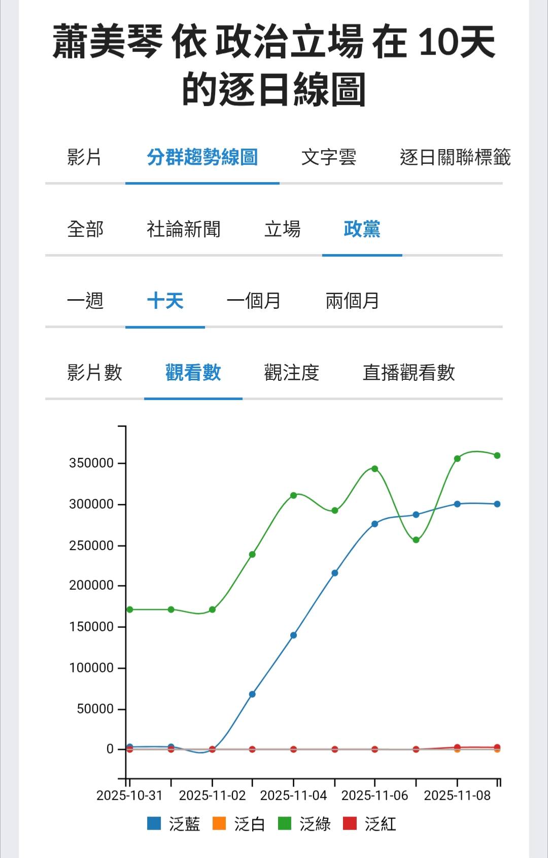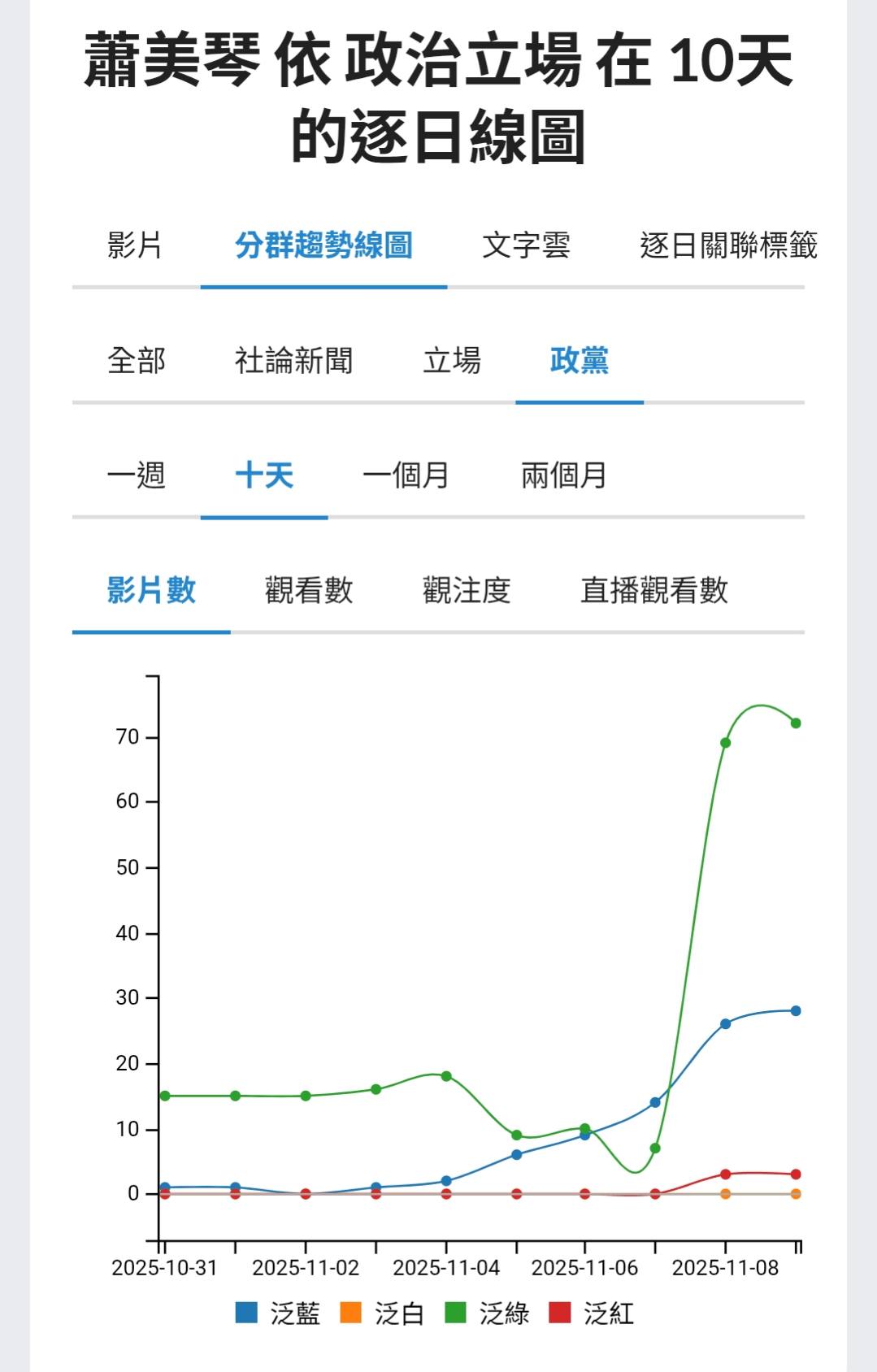 然而,泛藍的趨勢也在11月8日後開始竄升,顯示國民黨與其支持者開始集體進場評論。部分藍營網紅與媒體節目以「外交作秀」、「花錢買曝光」等標題切入,帶動第二波流量。