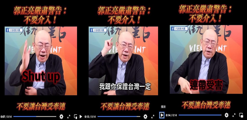 詭異的是,由綠轉藍的名嘴郭正亮拍了一個短片,背景底色紅咚咚,警告台灣人閉嘴,不要介入日本與中國的爭端。如果不聽他的警告,郭正亮保證台灣一定連帶受害(附圖一至三)。