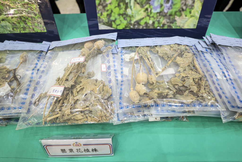 記者會現場展示 7 個案件成果,包含桃園地檢署指揮新北市調查處偵破國內首座依托咪酯(俗稱喪屍煙彈)製毒工廠案、台中地檢署破獲台灣首例罌粟花栽種案以及破獲一條龍分裝販賣外送喪屍煙彈等毒品案。
