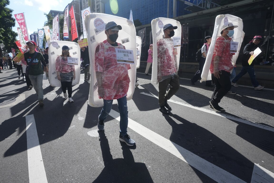 另外,也有多名移工將自己打扮成超市生鮮肉品,產地寫著「印菲越泰」,有效期限為 12 年,再貼上好管、耐操、便宜、廉價等標籤,指工作期限像是保鮮期,過了就要被拋棄。