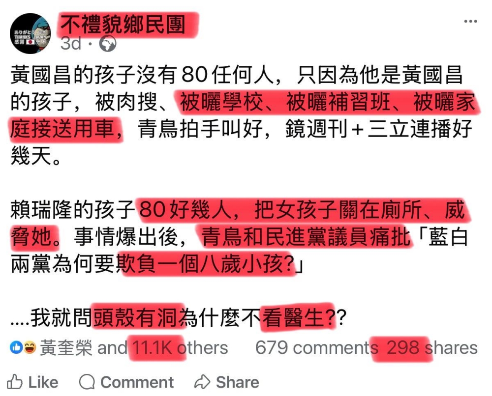 「黃國昌的孩子沒有80(霸凌諧音)任何人,只因為他是黃國昌的孩子,被肉搜、被曬學校、被曬補習班、被曬家庭接送用車,青鳥拍手叫好,鏡週刊+三立連播好幾天。」
