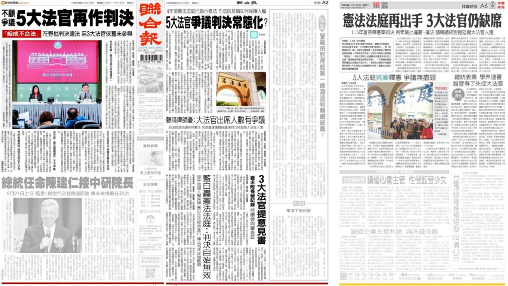 分享 憲法法庭正常運作讓兩小報很崩潰 聯合報放在頭版頭批判憲法法庭正常運作,並於A2版頭用特稿痛罵,帶風向稱原聲請律師有疑慮。 中國時報也堅稱5人判決無效,崩潰憲法法庭居然還獲學界支持。 因為憲法法庭就是讓藍白無法為所欲為、給習近平實質指導台灣政局的關鍵。 圖片來源:曾韋禎臉書 原文出自曾韋禎臉書,芋傳媒經授權轉載。 中國時報兩小報憲法法庭聯合報 分享 FacebookGoogle+電子信箱LINELinkedinTelegram