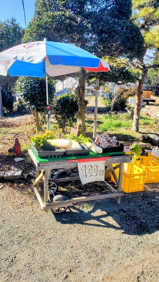 然後又經過路邊一個無人攤,又買了新鮮的大蘿蔔。標價是100日元一根,但是邊上有100日元一袋2根的大蘿蔔,標明有傷痕,可是我拿起來看了半天都沒發現傷痕,所以扔了一個100日元硬幣後,拿了1袋2根裝的大蘿蔔。