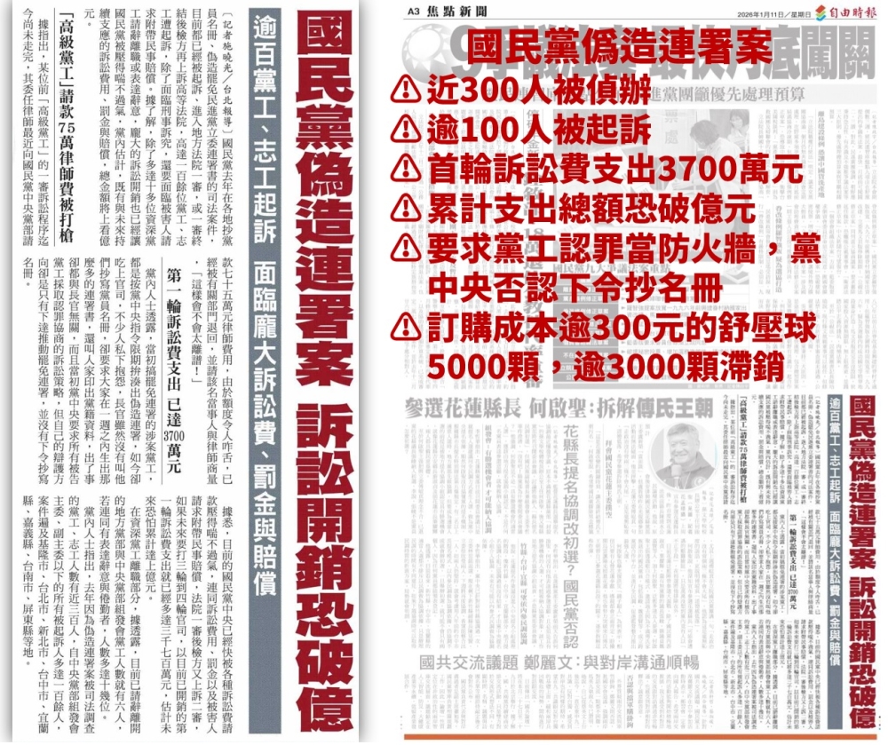 分享 國民黨才是大罷免大失敗 藍白不斷想用32比0唱衰民進黨在大罷免的失敗。但國民黨的偽造連署才最失敗、最可惡。 近300人被偵辦、逾百人被起訴;首輪訴訟費支出3700萬、累計支出總額恐破億元;還要求黨工認罪當防火牆,自己否認下令抄名冊,這完全就是渣男行徑。 最好笑的是,當初宣稱籌募訴訟費的5000顆舒壓球,成本逾300元,竟還超過3000顆滯銷。 圖片來源:曾韋禎臉書 原文出自曾韋禎臉書,芋傳媒經授權轉載。 偽造連署國民黨大罷免抄名冊民進黨黨工 分享 FacebookGoogle+電子信箱LINELinkedinTelegram