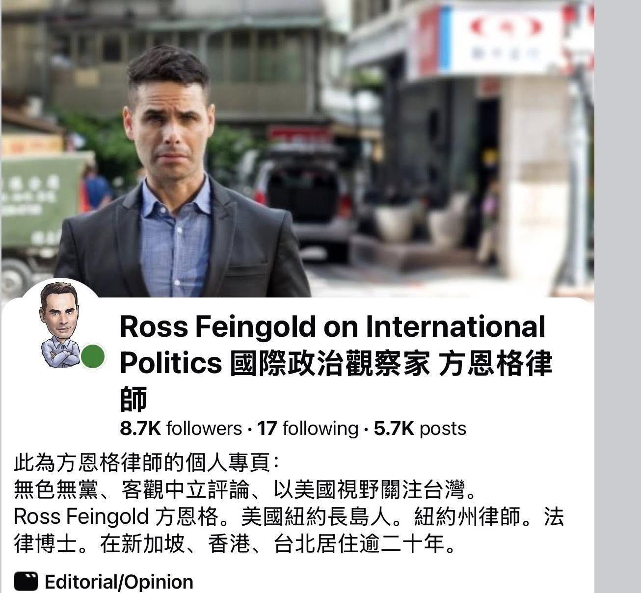 方恩格的臉書自介如下:無色無黨、客觀中立評論、以美國視野關注台灣。Ross Feingold 方恩格。美國紐約州長島人。紐約州律師。法律博士。在新加坡、香港、台灣居住逾二十年(附圖十)。