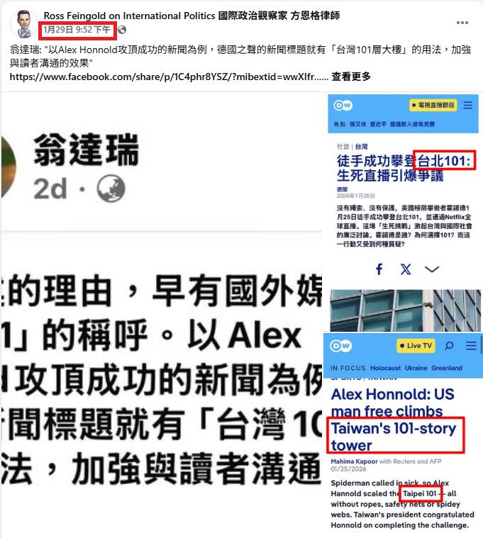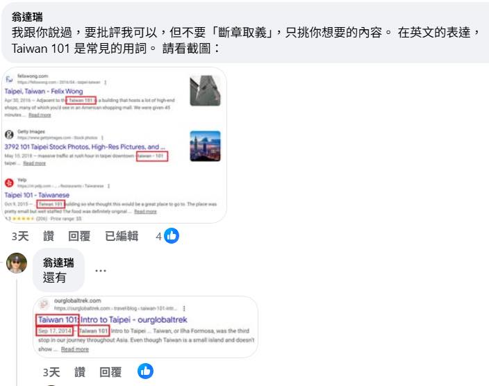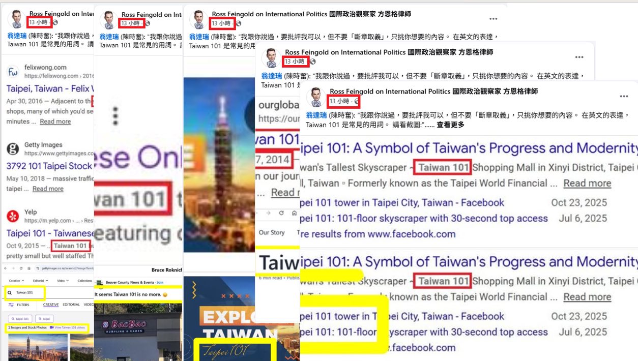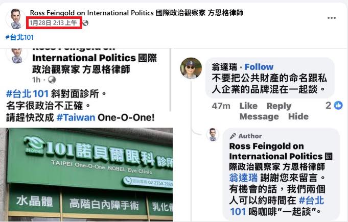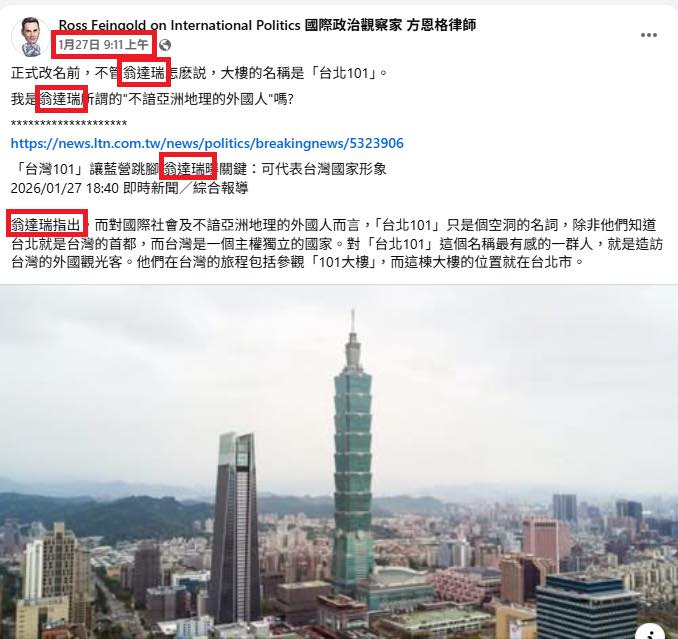 這個美國人叫方恩格(Ross Feingold),自封「國際政治觀察家」。方恩格在他的臉書粉專否定我的立場,堅稱大樓就是「台北101」。方恩格還明知故問,諷刺我會誤認他是「不諳亞洲地理的外國人」(附圖一)。