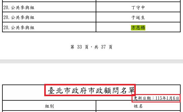 在台北市政府內部的一份名單(附圖十一),方恩格擔任市政公共參與組的顧問。這個職稱該不會就是蔣萬安美化市府網軍的名詞吧!
