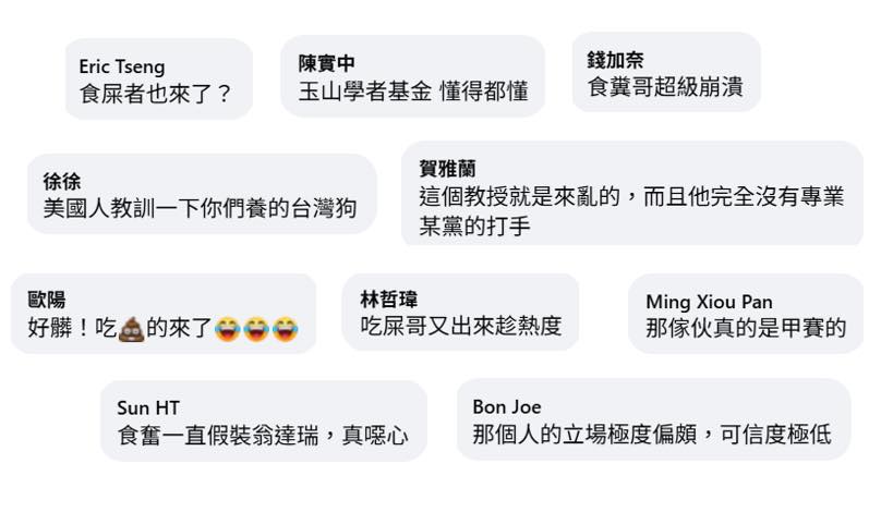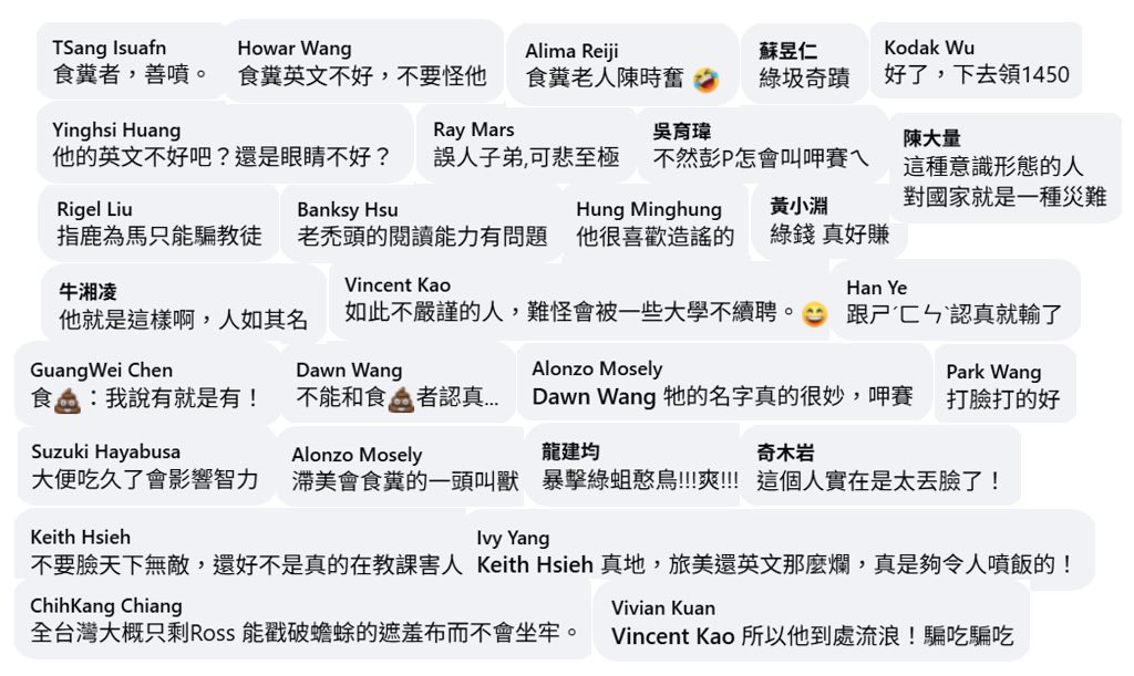 未料方恩格擷取了部分對話又貼一篇文,企圖製造我知識不足、英文不好的假象(附圖三)。這篇貼文吸引一些辱罵與攻擊的留言,多數的用詞污穢不堪,內容不符事實(附圖四)。