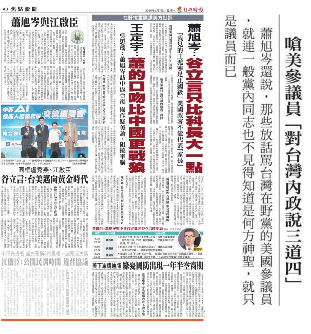 分享 國民黨不知道美國參議員有多大? 現在已經有5位超大咖參議員罵藍白舔中害台。蕭旭岑卻幫中國叫囂說,這只是議員而已,連黨內同志也不知是何方神聖。 不知道美國國會議員有多大的,可以看電影蓋世奇才。主角Charlie Wilson只是個眾議員,就能左右阿富汗的命運。現在是權力比眾議員大非常多的參議員,還是大黨鞭、委員會主席的超大咖參議員。是足以讓國民黨消失的力量。 圖片來源:曾韋禎臉書 原文出自曾韋禎臉書,芋傳媒經授權轉載。 國民黨美國參議員蕭旭岑 分享 FacebookGoogle+電子信箱LINELinkedinTelegram