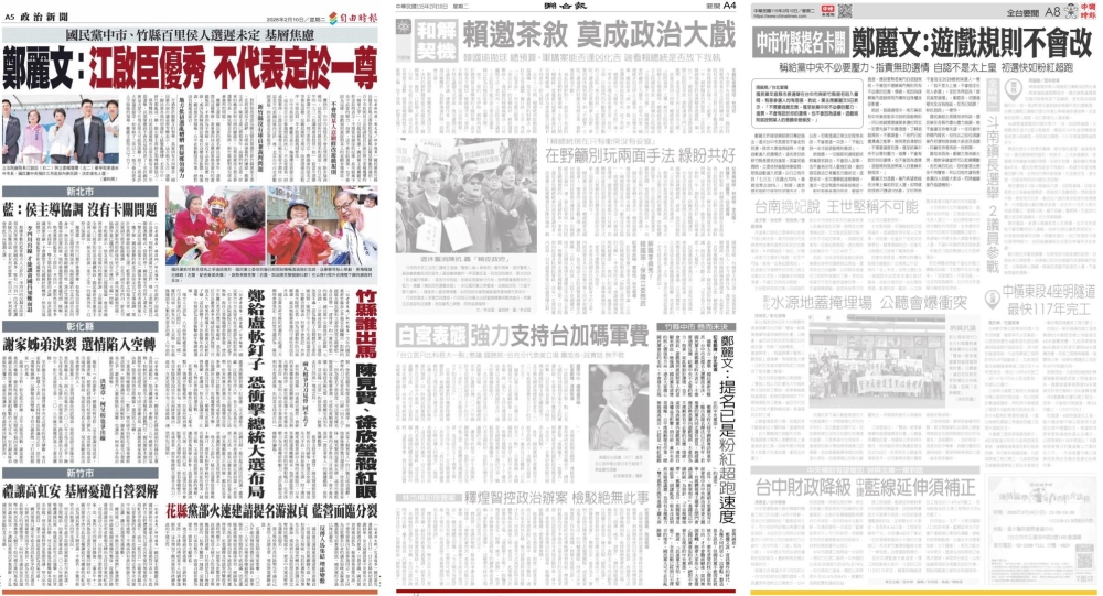 分享 只看兩小報 國民黨太平穩沒事 國民黨在各地方都有提名問題,自由時報今天做了一整版。 不過只看兩小報的話,國民黨在鄭麗文的英明領導下太平穩沒事。尤其是聯合報,推崇鄭麗文是用粉紅超跑的速度為國民黨盡心盡力,那些地方的不要不識好歹,當起民進黨側翼! 圖片來源:曾韋禎臉書 原文出自曾韋禎臉書,芋傳媒經授權轉載。 兩小報國民黨聯合報自由時報鄭麗文 分享 FacebookGoogle+電子信箱LINELinkedinTelegram
