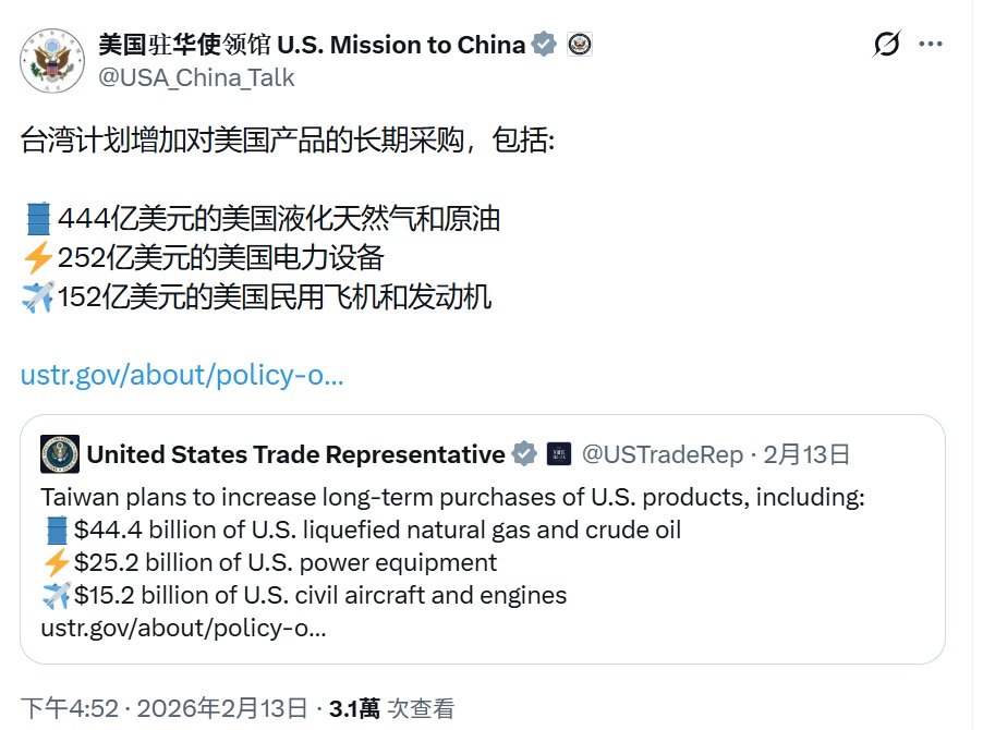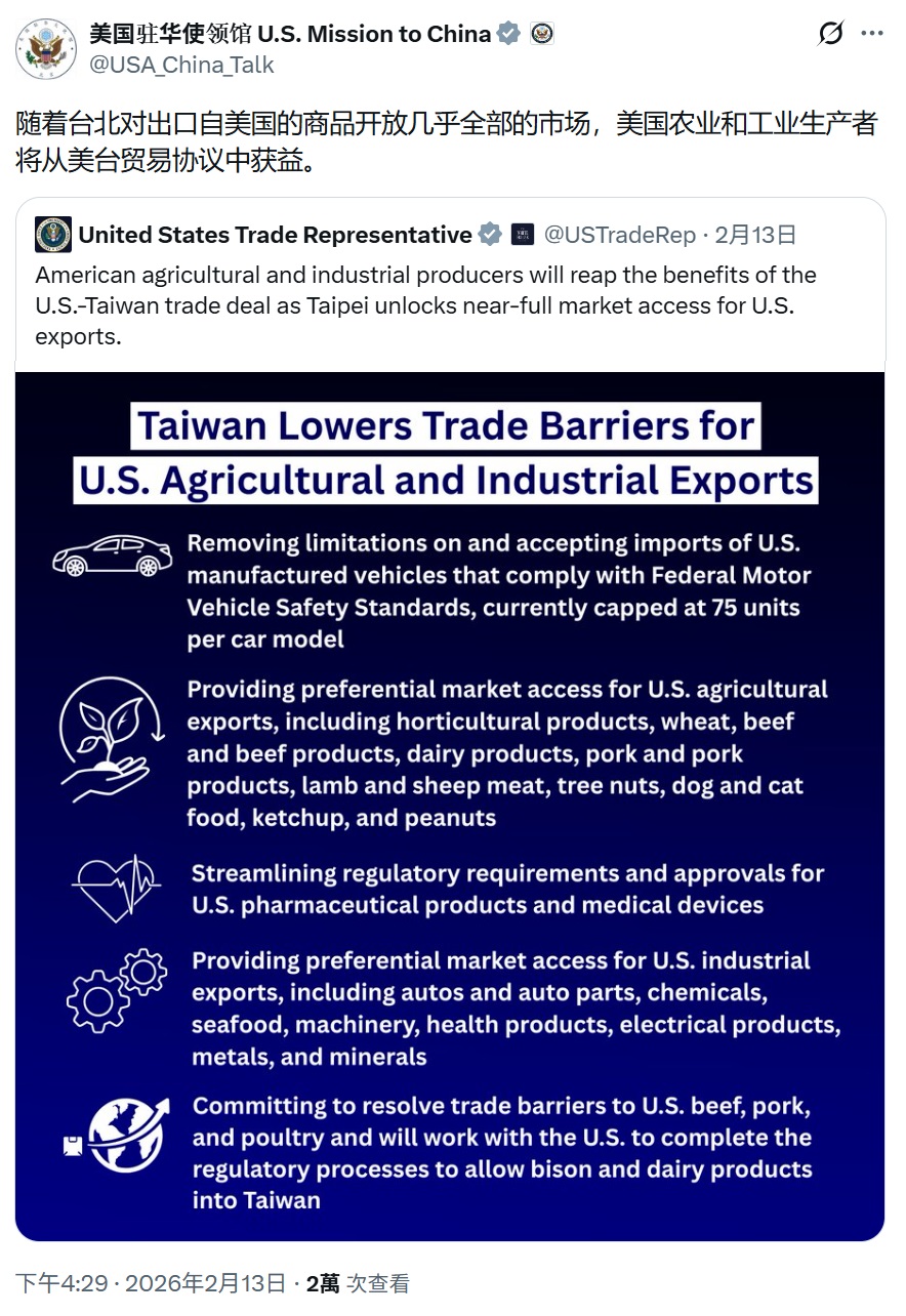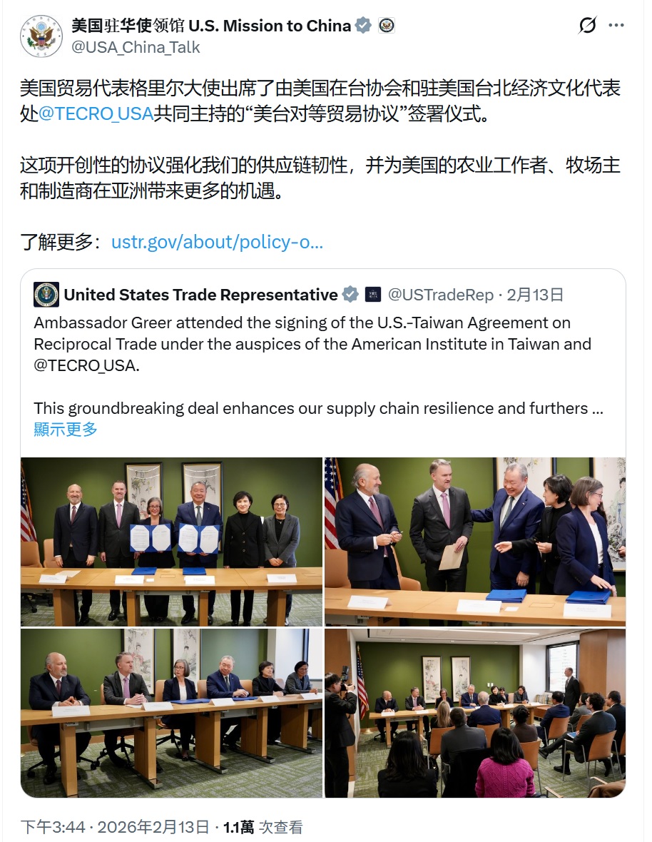 分享 美國很懂得如何噁心中國 美國駐中國大使館的X,昨天連發3文,刻意轉貿易代表署X歡慶台美對等貿易協定的發文,並用簡體中文撰寫短評。包括美台簽了協定好爽好開心的4張照片。台北對美國幾乎開放所有的市場,美國農、工好開心。台灣計畫向美國採購848億美元。 完全沒在考慮中國的感受。非常地梁文傑! 原文出自曾韋禎臉書,芋傳媒經授權轉載。 中國台美對等貿易協定大使館美國貿易代表署 分享 FacebookGoogle+電子信箱LINELinkedinTelegram