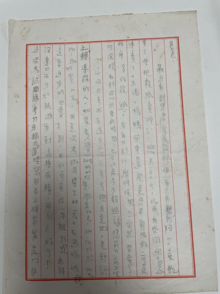 今天哥哥在家裡整理發現這封信傳給我,這是一封我大概小學三年級之間寫給在日本的爸爸的信,信中提到我把書房裡的報紙(總共33公斤比一些同學還重呢),賣給回收紙類的人(小時候管他叫啊木酒矸,就是酒矸倘賣無的那個酒矸),得意洋洋說賣了15塊,被媽媽責備說要留著給爸爸剪報呢怎麼趁他不在他偷賣了,又說考了396分進步了老師又有獎勵40塊。