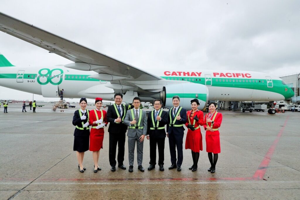 國泰航空說, 80 週年首架特別塗裝客機今天也飛抵桃機,象徵慶祝活動正式在台展開,這款綠白相間條紋的復古塗裝在 1970 至 1990 年代深受旅客與航空迷喜愛,是極具代表性的經典設計,今年推出致敬版本不僅重現當年風貌,也象徵自 1946 年創立以來走過 80 年重要里程碑。